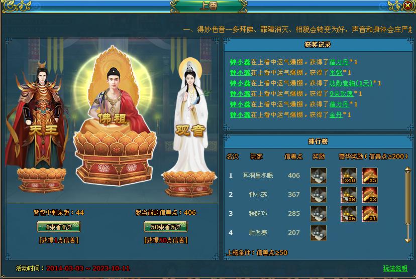 香为参加本活动的道具,每次上香都可获得随机奖品1份并获得一定数量信善点,玩家也可消耗大量香多次上香获得随机奖品多份并获得大量信善点