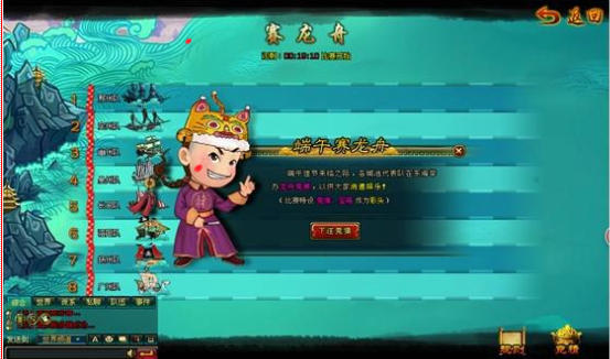 【活动内容】:时值端午佳节来临之际,各大城池纷纷派出代表队于东海之滨准备举办龙舟竞赛,以供各位大老爷、小主消遣娱乐~~然而在比赛之前,就有一位手眼通天的神秘人物进行坐庄,广邀各方贵人下注竞猜,比赛途中更会出现大量神秘宝箱被众人抢夺哦,快来参与吧!