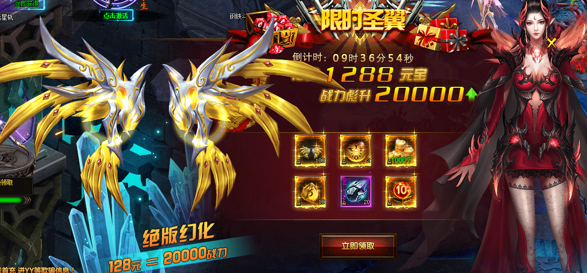 活动内容: 玩家一次性花费1288元宝即可获得+20000战力绝版圣翼幻化奖励!