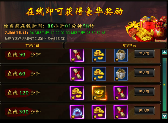 活动内容:合服三天,每天在线达到一定时长就可领取丰厚奖励
