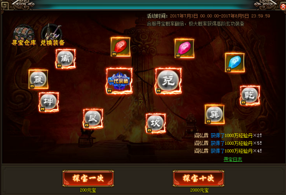 10000 | 独孤求败 | 12级宝石箱 | 玄功进阶丹*150 | 200万铜钱 | 8倍8小时 |