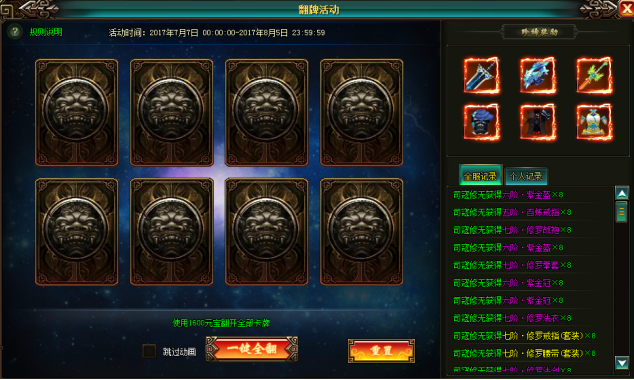 活动内容:合服翻牌活动发放大量高阶金色套装,概率翻倍,还有机会获得麒麟神装