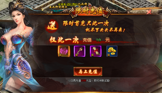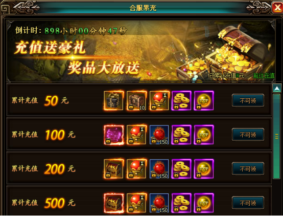 活动内容:充值小笔金额获取高额奖励,合服期间活动只此一次,不容错过