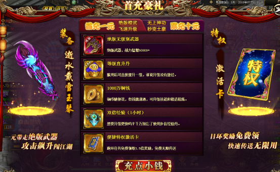 首充1元 | 绝版红色武器 | 80级直升丹 | 1000万铜钱 | 双倍经验(1小时) | 便捷特权3日激活卡 |