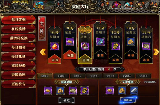 活动内容:通过签到,充值,特权,在线,登录等获取丰厚奖励