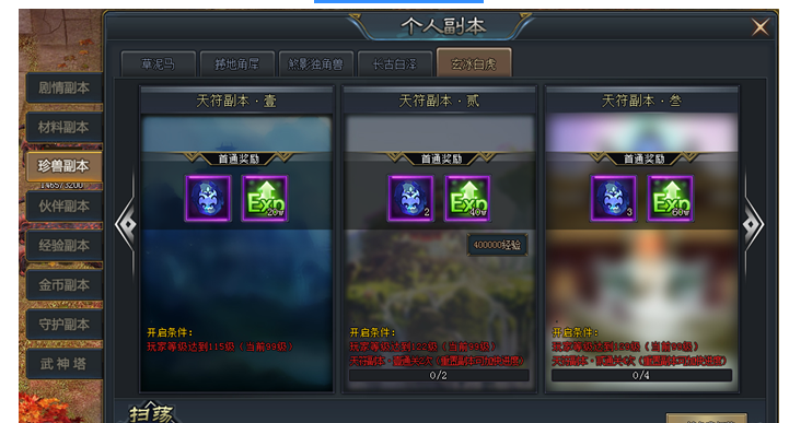 珍兽副本包括:羊驼、白泽、白虎、独角兽、角犀五个副本,每个副本又分为壹、贰、叁……共十个等级,每个副本每天可进入1次,首通之后可获得大量精血同时还可获得大量经验,挑战后消耗元宝可重置并扫荡,并返还绑定元宝,花多少,返多少!