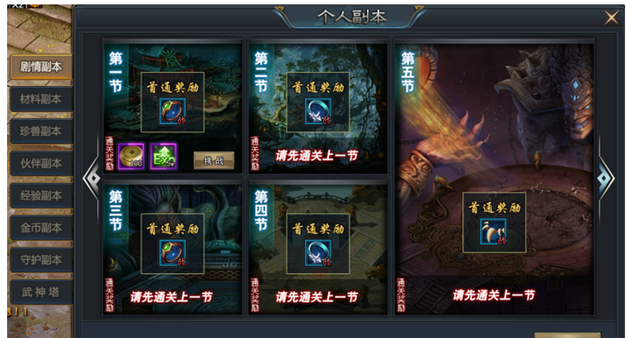 剧情副本每一章各五节,每个副本每天可进入1次。通关上一副本,即可解锁后续副本。同时副本还可以一键扫荡,节省时间,直接获得已通关副本的经验铸币!