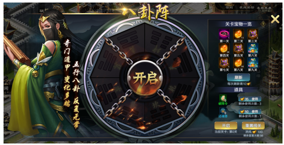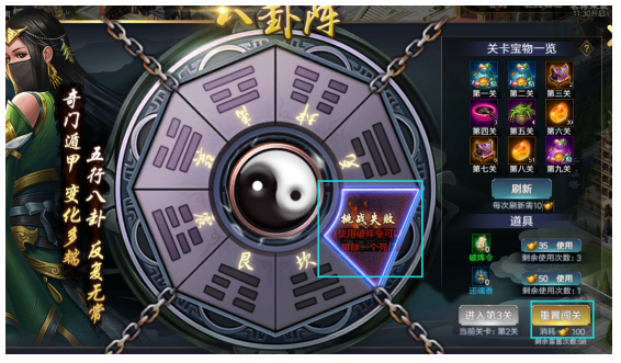 八卦阵一天可以免费进入一次。总共9关。通关后如想再次进入。需要点击重置闯关(花费100元宝)。