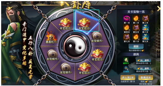 点击开始进入八卦阵中。八卦阵每一格对应一个关卡。关卡内容分为:宝物、铜币、死门。每轮只能获得一个关卡的奖励。获得后进入下一轮。