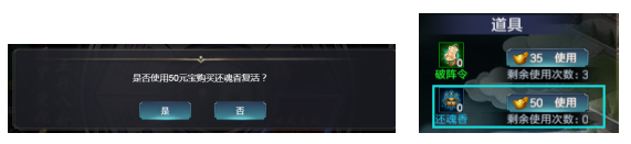 返魂香:遇到死门死亡后。可以进行复活。一轮游戏只能复活一次。复活需要消耗50元宝