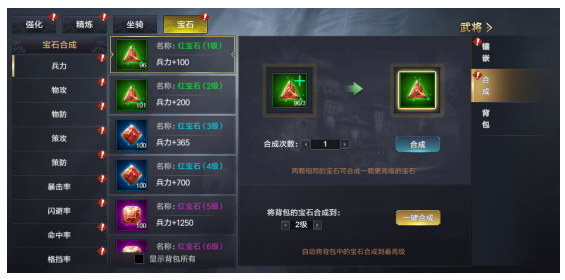 合成:相同类型和等级的宝石可以进行合成。3颗合成1颗。合成后类型不变,等级+1。