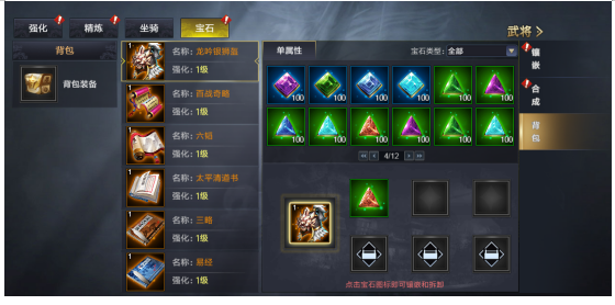 背包:可以选择背包中的装备,镶嵌和取下装备上的宝石。