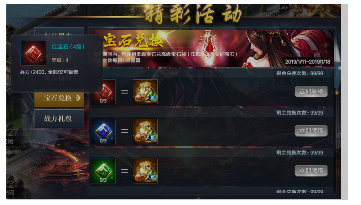 活动内容:活动期间3颗同属性四级宝石,兑换五级自选宝石袋*1。