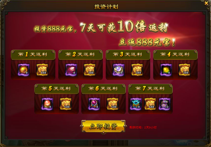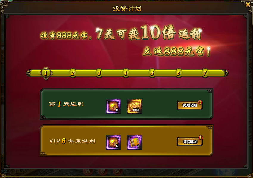 l 活动内容:一键投资超值返利,投资理财开服前三天可以购买,只需888元宝,每天可领取成长丹和绑定元宝返还,达到VIP6每天还可领取额外奖励。