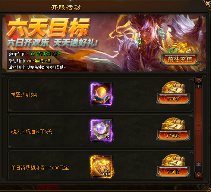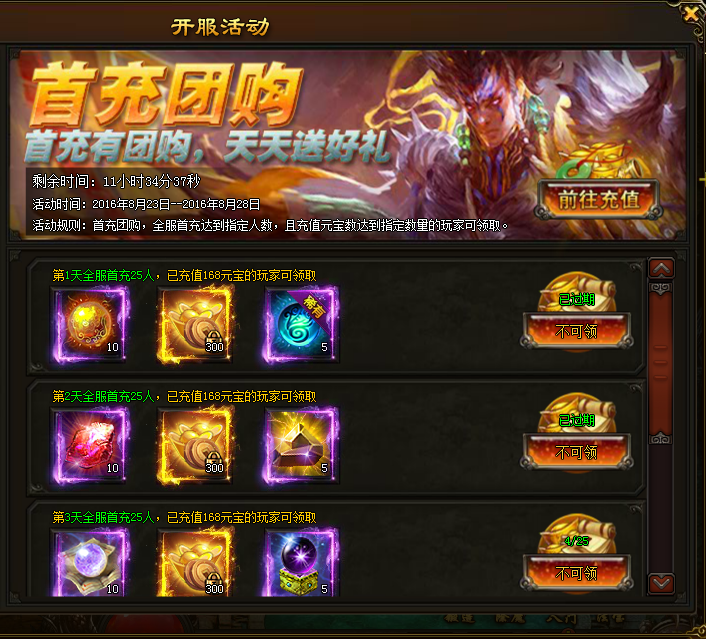 l 活动内容:充值人数达到25人时全服充值过168元宝的玩家都可以领取高级奖励,奖励是和每天对应的冲榜有关的哦