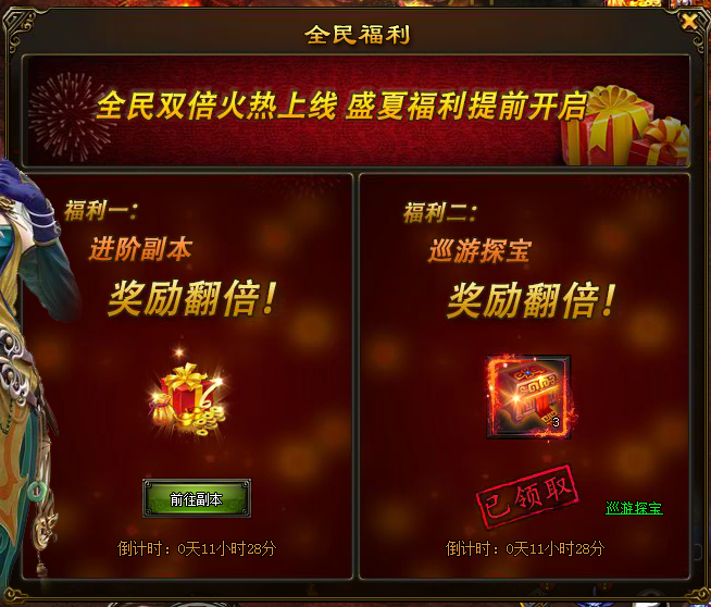 l 活动内容:从开服开始持续三天时间,玩家在三天内可以获得进阶副本与巡游探宝奖励翻倍