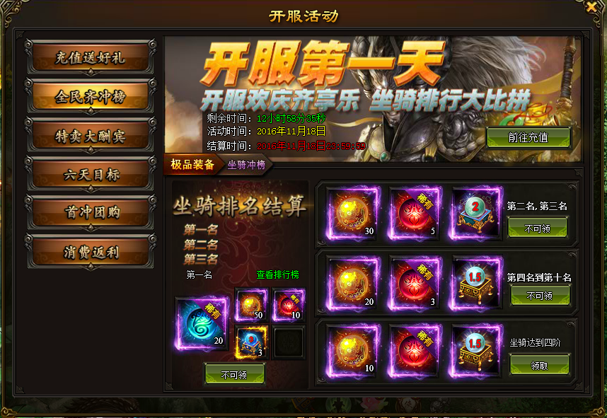 l 活动内容:通过开服活动按钮进入全民齐冲榜,从开服第一天开始每天不同的进阶系统冲榜会给予玩家相当高额的奖励
