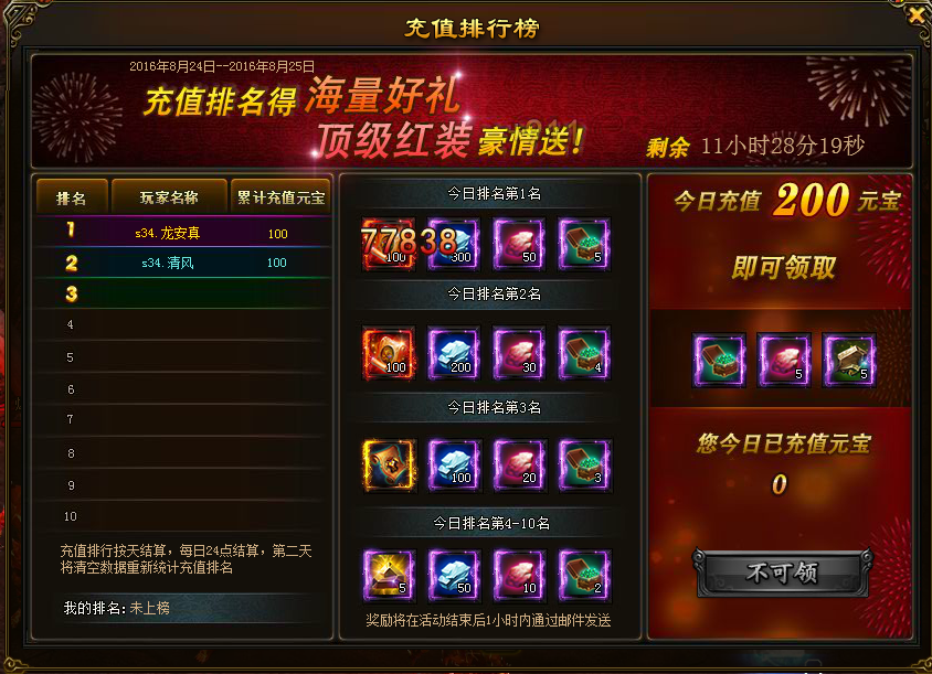 l 活动内容:开服第四天和第五天开启充值排行榜,每天24点结算各结算一次,充值最高的玩家可以获得极品红装与其它道具的丰厚奖励,当日充值达200元宝的玩家可以领取参与奖励,充值排行只统计当天前10名的玩家哦
