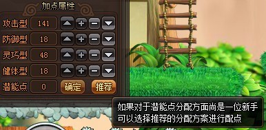 如果你实在是懒得去研究怎样加点的话,你可以点击推荐按钮,系统会按攻、防、灵、健以2:1:1:1的比例加分配。这个加点其实是非常中庸的,但也不是说一也是处,这样加点的话因为全面发展,给人感觉好像能攻能防而且闪避暴击都有血量和查克拉值还不错。但认真一打好像并没有想象中的那样好。但比较适合新手发展。