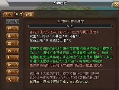八门分别为:开门、休门、生门、伤门、杜门、景门、惊门、死门。当每一个打开一个门的穴道人物就会有着一定的人物属性提升,当八门全开时任务周边的玩家都会获得经验加成,不单单只是这样哦,就连旁边的怪物都会受到爆穴之后被秒哦。
