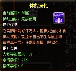 在职业忍术这类里,我们接触到第一个 忍术,体能强化。被动技能,被动加成无需使用。是体能修炼的方法可以极大的强化体质。能提高自己的生命值上限,每提高一层,多增加12点的血量上限。