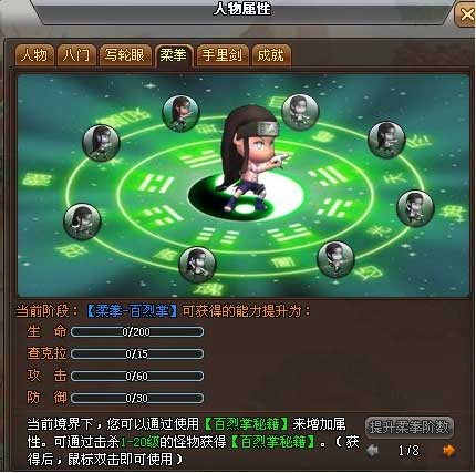 火影世界的忍者都被赋予了可以学习、掌握柔拳的天赋,从1级开始,我们就可以在人物属性面板中查看到自己柔拳学习进度的属性面板。随着柔拳掌握的阶段越高,将会为自身带来越多的好处!