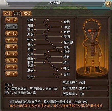 首先想要开启八门面板,就要选择你需要的穴道。然后点开相应穴位进行进一步的操作。打开面板后单击【开通穴道】按钮后,如查克拉精华足够进行本次操作,则会扣除相应查克拉精华,打通八门后,点击八门遁甲界面的“突破瓶颈”,就可以开启八门。全部里八门内穴道打通后,可以获得更为吸引人的强大属性加成,并且所有忍术的当前层数都会提升3层。同时如附近为怪物,则怪物会受到爆穴造成的伤害。但是开通穴道也是有成功失败率的,想要提高就可以使用八门灵符来提高穴道成功率。