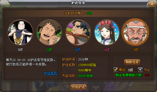 每天20:00-20:30为护送任务双倍时间,这期间完成任务奖励双倍。