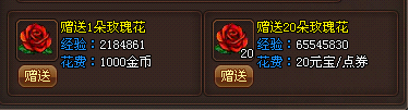 送花可以选择赠送1朵(消耗1000金币)或者一次赠送20朵(消耗20点券),一次赠送20朵玫瑰收益将会更多!(等级越高,收益越高)