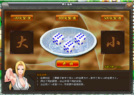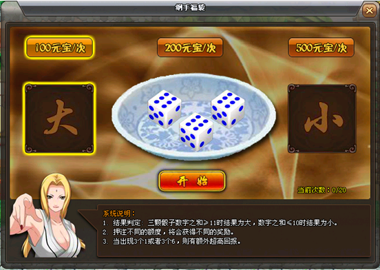 3、您首现需要选择想要投入元宝的数量,再选择所压的大小,都选择好后,即可点击开始进行开奖啦。