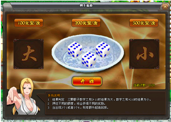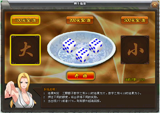 3、您首现需要选择想要投入元宝的数量,再选择所压的大小,都选择好后,即可点击开始进行开奖啦。