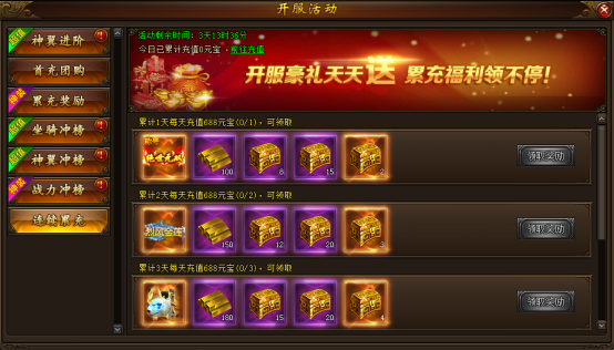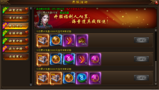 活动期间,每日累充达到一定金额可领取大量奖励,还能领取极品神装。