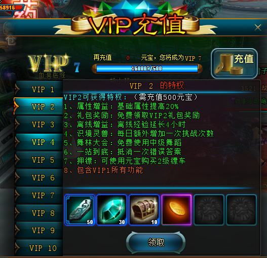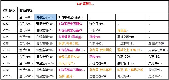说明:高级VIP拥有所有的不同低级VIP的特权,比如VIP5的玩家,拥有VIP1~VIP4中所有不同的特权。