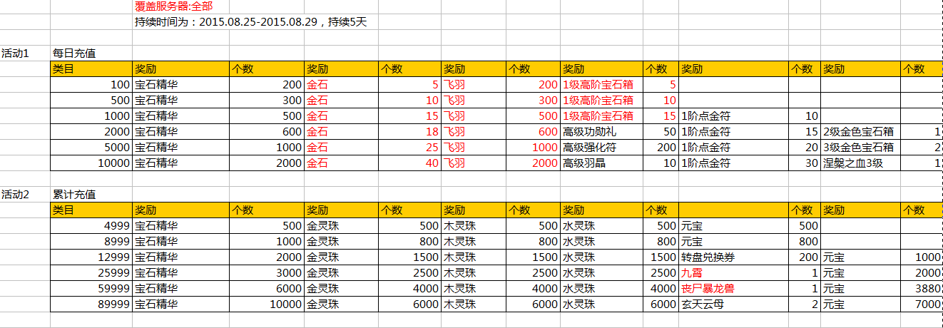 | 礼包2 | 金灵珠*100 | 木灵珠*100 | 水灵珠*100 | 火灵珠*100 | 土灵珠*100 | ||||||||