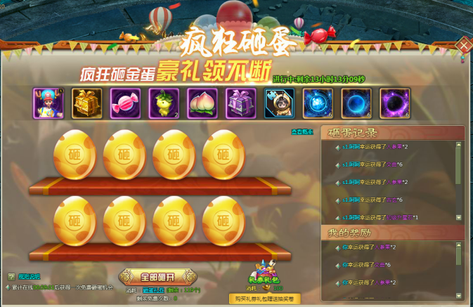 3. 每轮8颗金蛋,点击全部砸开可以一次性砸开8颗金蛋,领取全部奖励。砸完后可以刷新金蛋,继续砸蛋。