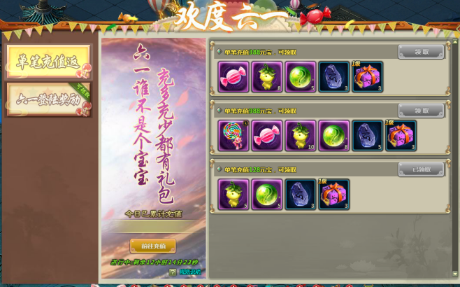 2. 若单笔充值金额高于更高的档次,则无法领取较低档次的奖励(例:单笔充值达到1000元宝,可以领取988元宝档次奖励,但是无法领取128和388元宝档次奖励,需要单笔充值大于388元宝但小于988元宝,才能领取388元宝的奖励)