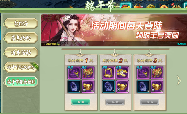 活动规则:活动期间,玩家每天登录可以领取登录奖励,累计登录天数越多,奖励越丰厚