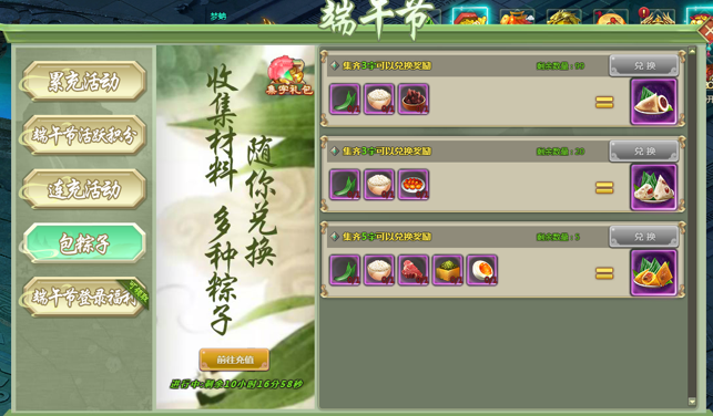 活动规则:活动期间,玩家通过挂机,参加活动等方式,可以收集到粽叶、糯米等粽子材料,收集一定材料之后,即可兑换相应礼包,礼包内可开出超值奖励和龙舟行的道具