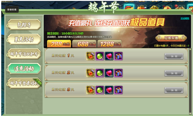 活动规则:活动期间,玩家每天累计充值达到一定额度即可领取奖励。连续多天充值达到一定额度,可以领取超值奖励。
