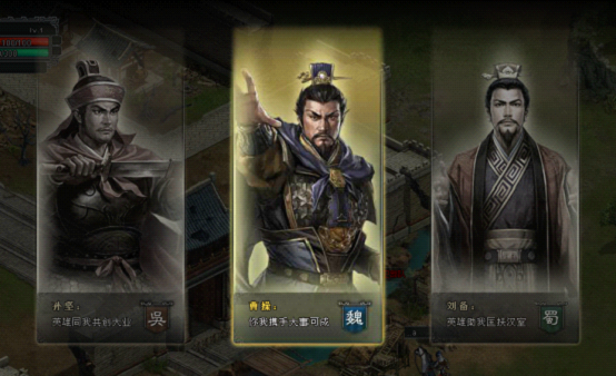 在玩家刚加入游戏之后,玩家角色在汜水关斩杀华雄,引得三国主公纷纷争抢,这时就要选择玩家所要从属的阵营了。