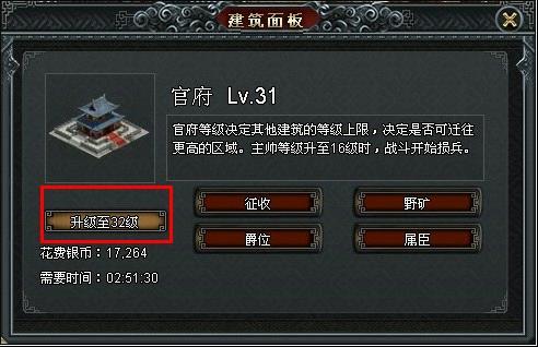 城池中的建筑需要不断进行升级才能获得更好的效果。选中建筑,点击“升级”按钮,会立即完成升级。升级完毕后,建筑队伍需要进行一定时间的休息才能进行下次升级。
