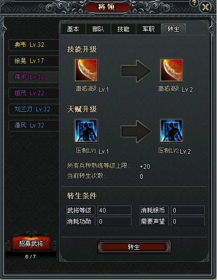 武将达到一定等级与声望后可以进行转生,增加将领技能等级与兵种熟练度上限。