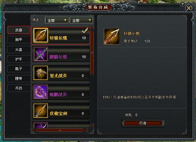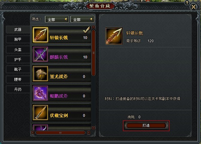 右边会显示所需要的材料和消耗的银币,点击“打造”即可开始合成操作,材料与银币不满足合成要求则无法合成。
