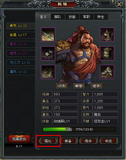 在武将界面内点击“强化”按钮