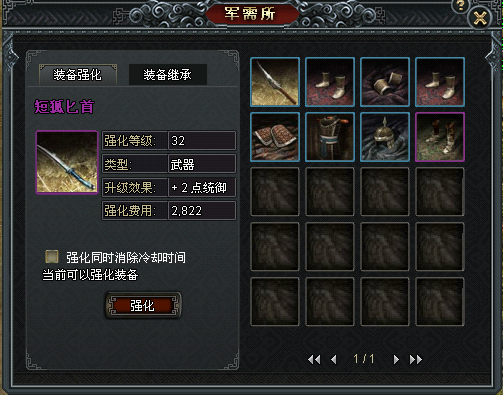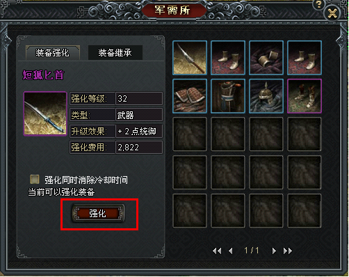 在右边军需所内点击需要强化的装备,这时该装备就会出现在左边的框中,同时可以看到装备的升级效果和升级费用。