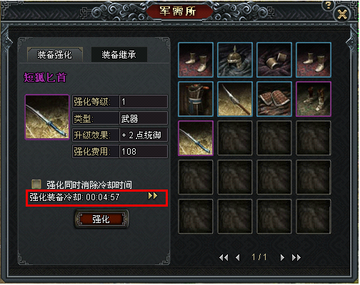 每次强化成功后会有5分钟的强化冷却时间,冷却时间可以叠加,最多可叠加到35分钟,达到35分钟时必须要等强化冷却时间消失后,才能继续强化,冷却CD可以用金币秒掉。