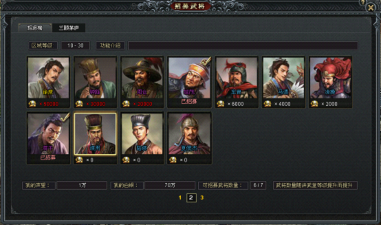 玩家达到一定声望后,可以在讲武堂内的“招贤榜”花费银币招募将领。