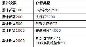活动要求:活动期间累计祈福达到指定次数,可以获得对应奖励,每项奖励每个玩家只能领取1次