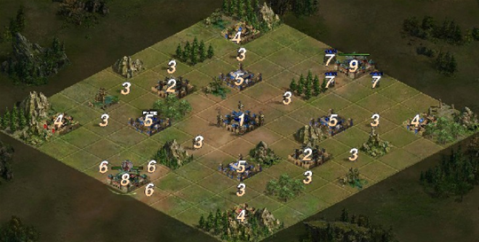 a) 玩家的所有部队都会优先执行移动操作,在自己的行径路线上并且还未移动时,前方有敌方部队,会执行攻击操作,攻击胜利后会进行移动