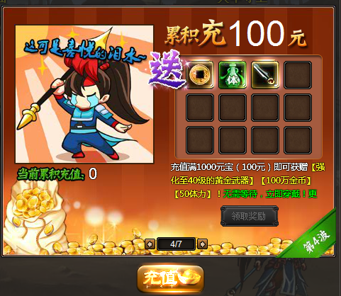 4、新服累计充值达100元,即可额外获得40级黄金武器、金币、体力:
